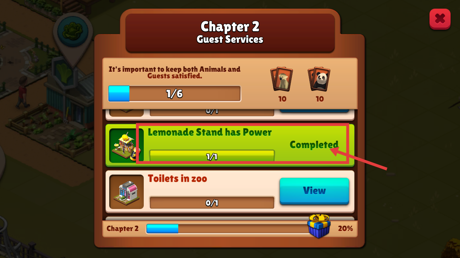 4、成功建造后,【LemonadeStandhasPower】任务会显示【Completed】,推动章节进度,可继续进行其他设施的建造任务。