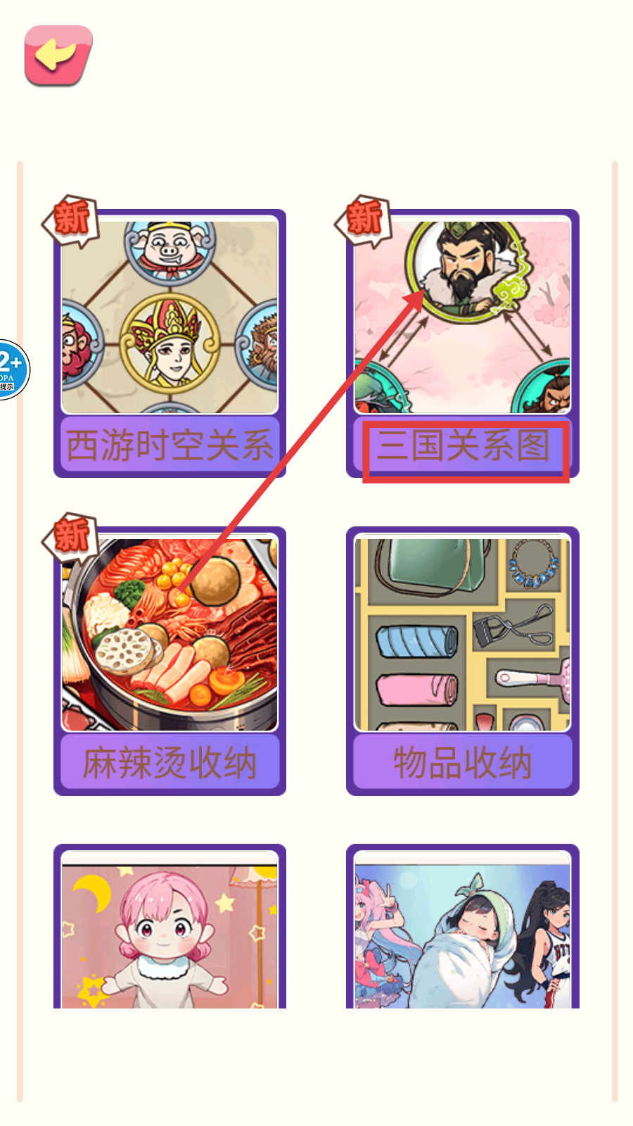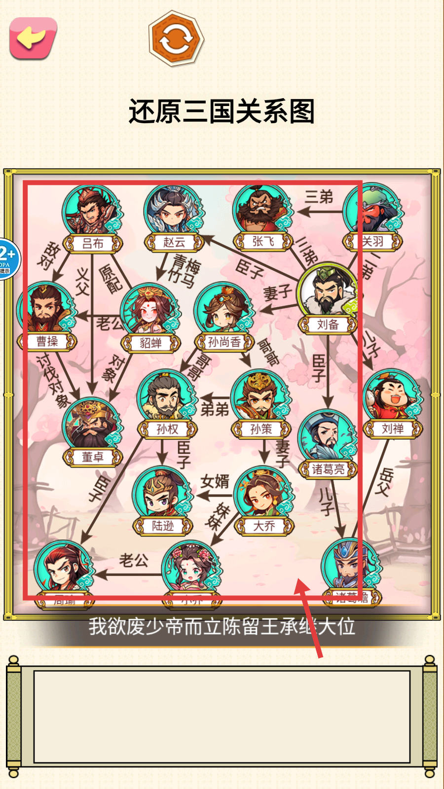 1、选择【三国关系图】关卡,进入后可见以刘备、关羽为核心的关系网,准备从下方人物中选取来还原。