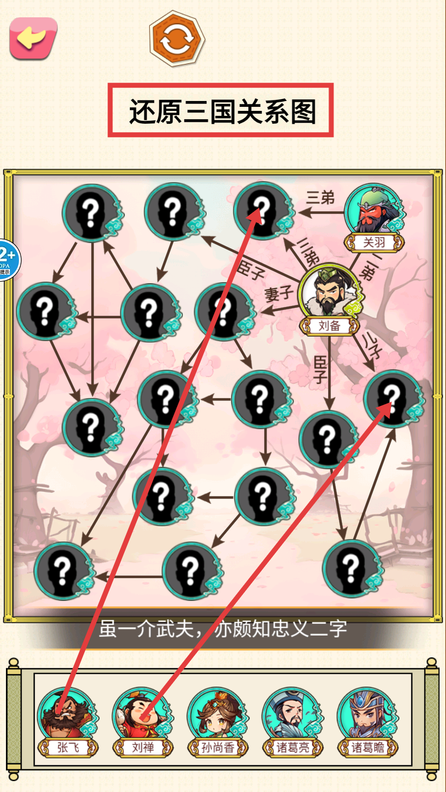 2、依据三国人物关联,从下方的【张飞】【刘禅】【孙尚香】等人物里,挑选符合“三弟”“妻子”“儿子”等关系的角色放入对应问号位置。