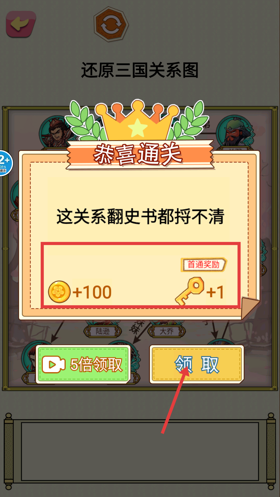 4、成功还原后通关,可领取【首通奖励】,获得+100金币和+1钥匙,也能看视频选择5倍领取奖励。
