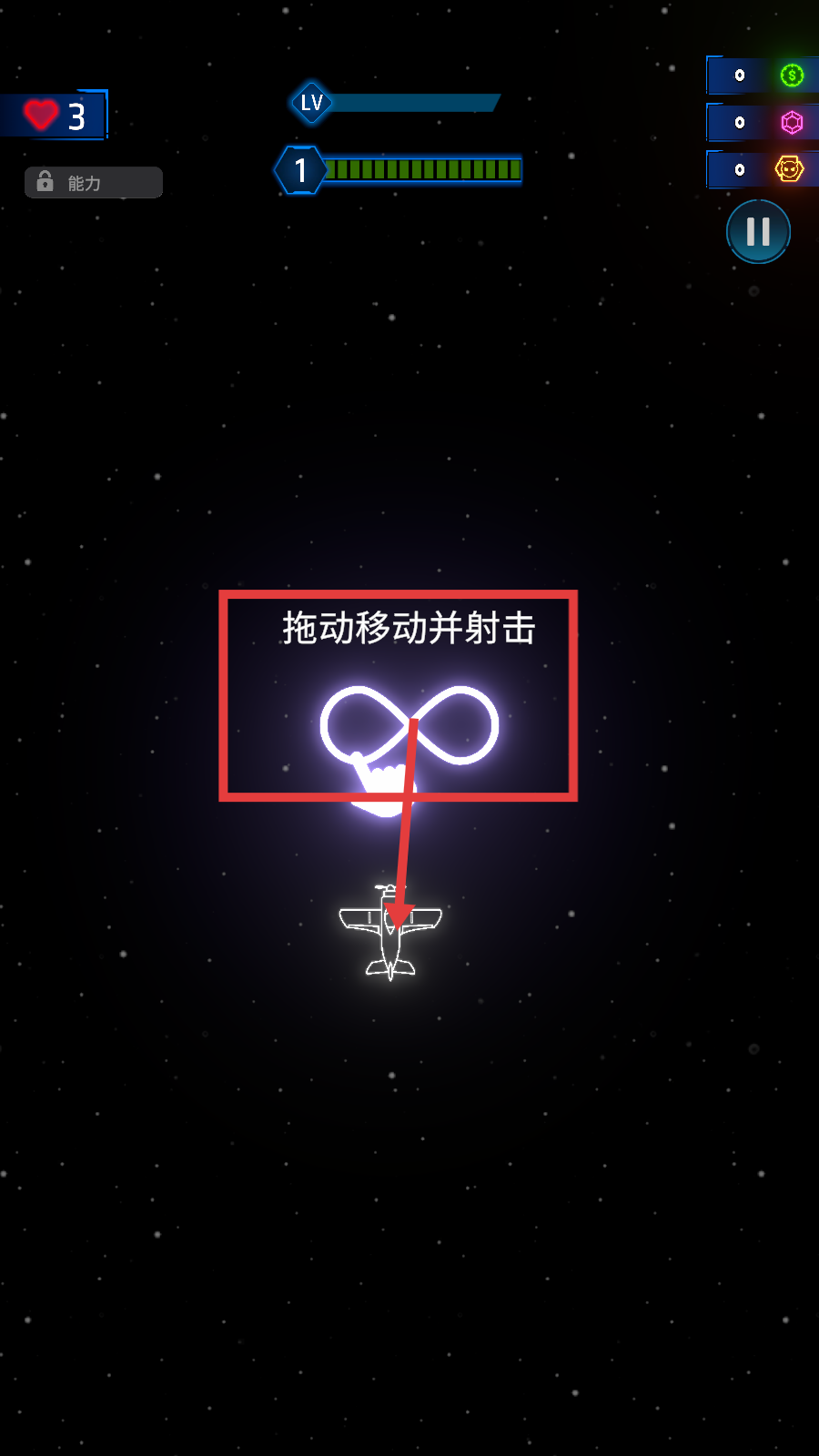 1、进入游戏后,根据“拖动移动并射击”的提示,操控飞机在星际场景中移动,同时触发射击,攻击目标。