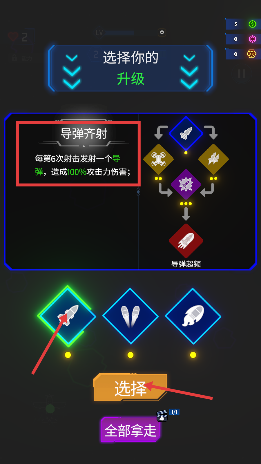 3、在升级界面,可选择【导弹齐射】这类升级选项,点击“选择”按钮,增强飞机的攻击效果。