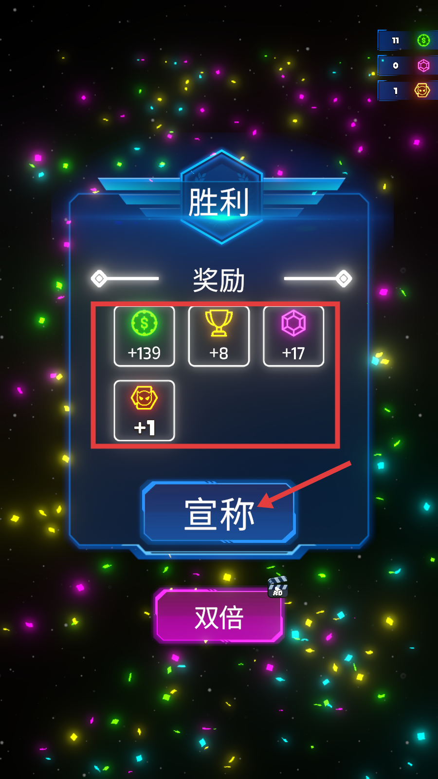 4、战斗胜利后,会获得金币、奖杯、晶体等奖励,点击“宣称”按钮领取奖励,为后续挑战积累资源。