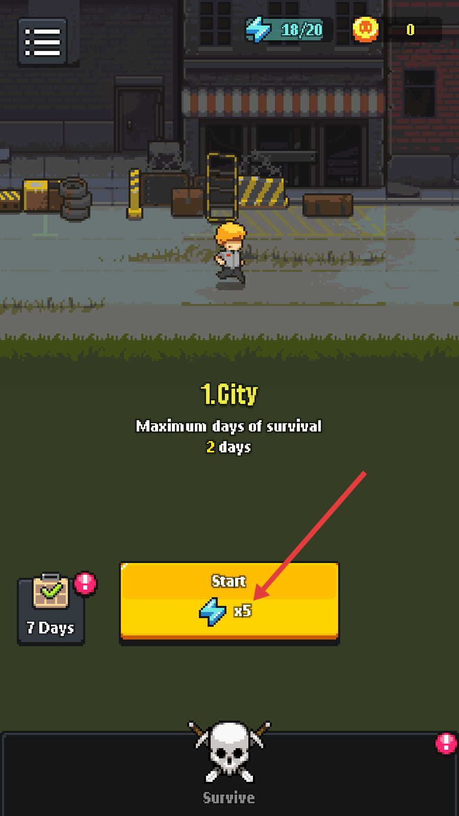 1、进入游戏后,可选择【City】场景开始,点击带【x5】闪电图标的【Start】按钮,开启生存挑战。
