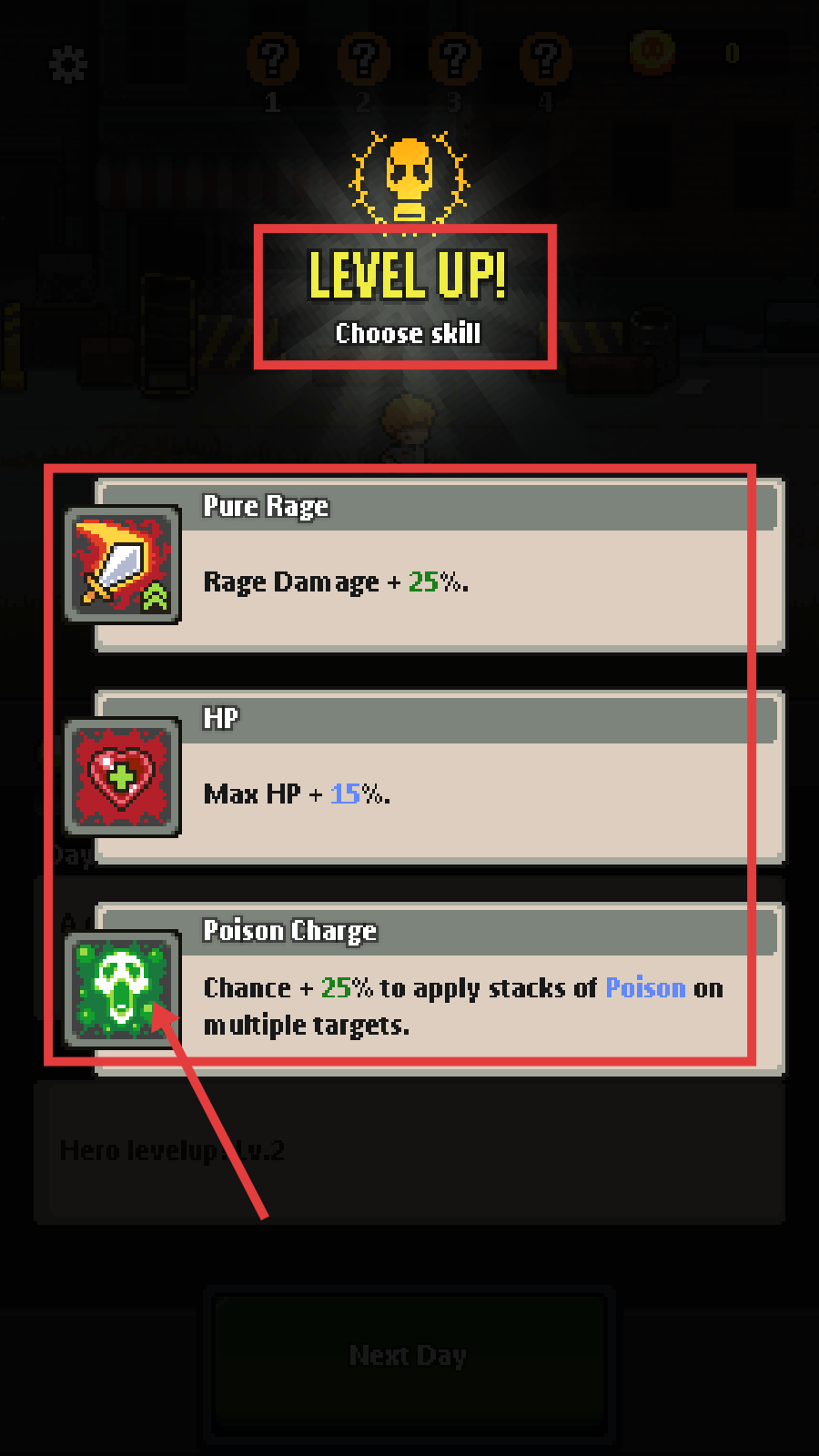 4、角色升级时,会出现【LEVELUP!】技能选择界面,可从【PureRage】【HP】【PoisonCharge】中选适合的技能增强战力。