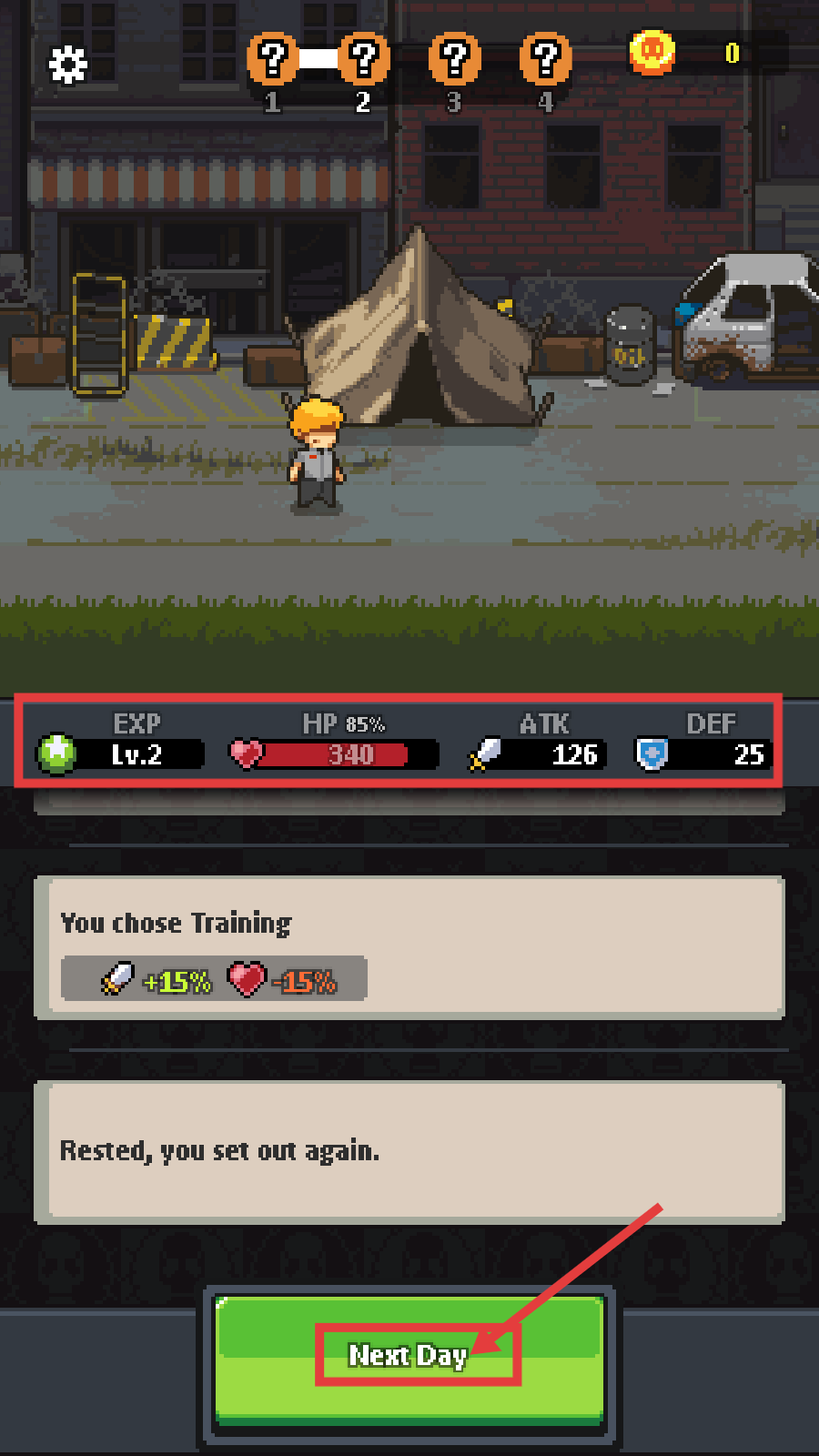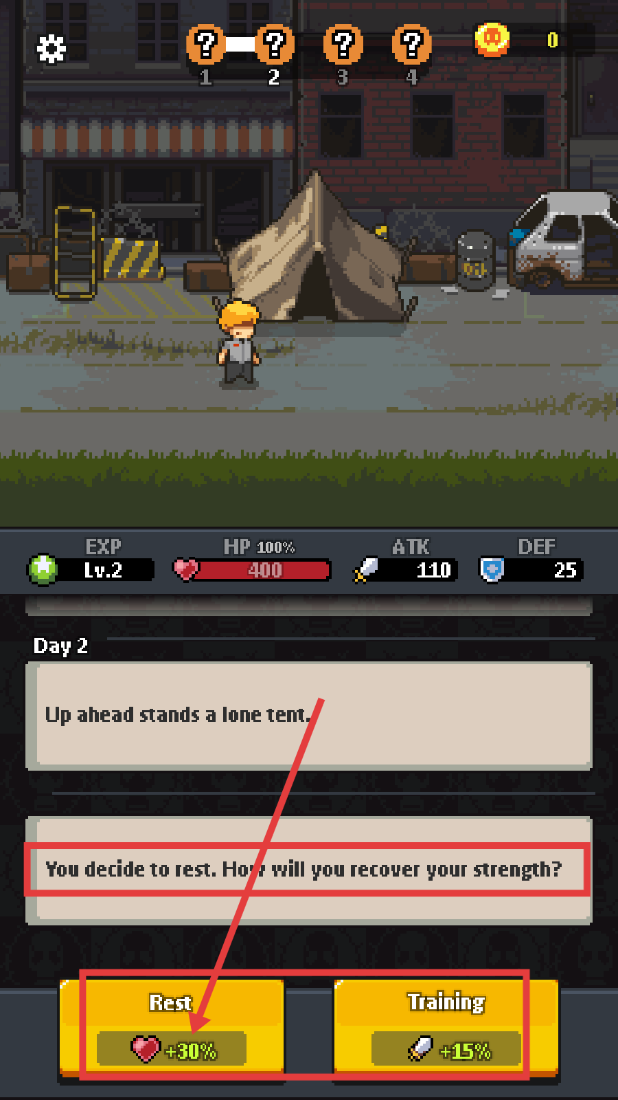 3、到第二天时,若要恢复体力,可选择【Rest】提升30%生命值,或选【Training】提升15%攻击力,根据需求抉择。