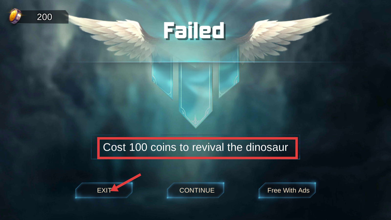 4、若挑战失败出现【Failed】界面,可花费100金币复活恐龙,也能选择【EXIT】退出或其他选项重新开始挑战。