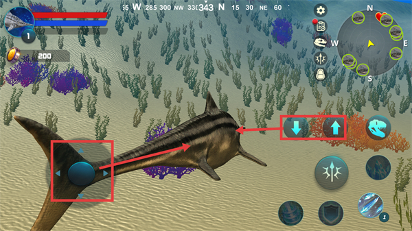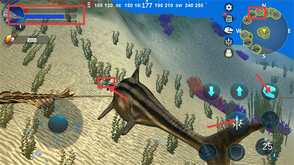 2、冒险中用尾部虚拟摇杆控制恐龙移动方向,借助【↑】【↓】按钮调整位置,同时熟悉右侧技能等操作按钮的作用。