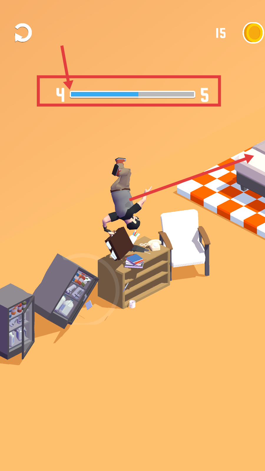 3、移动过程中,关注“4-5”进度条的填充,避开或利用周围家具等障碍物,向终点区域前进。