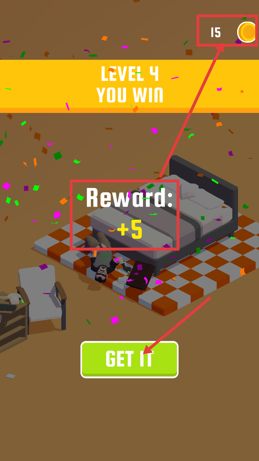 4、成功到达目标区域后,即可通关【LEVEL4】,点击【GETIT】领取【Reward:+5】的奖励,金币数量也会相应更新。
