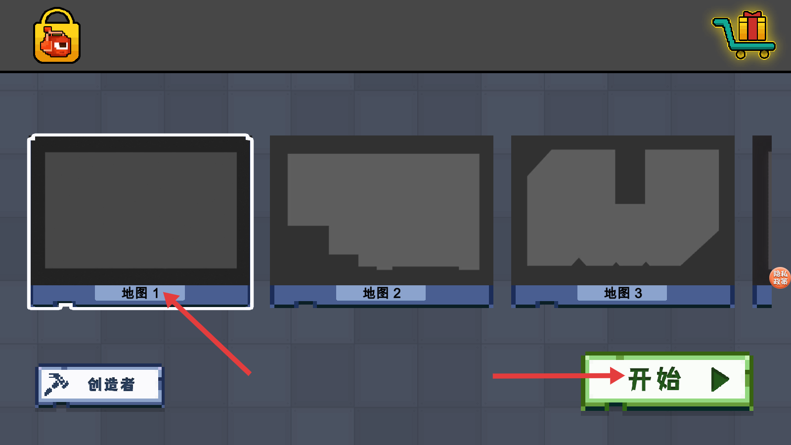 1、选择【地图1】后,点击右下角的【开始】按钮,即可进入游戏场景开启冒险。