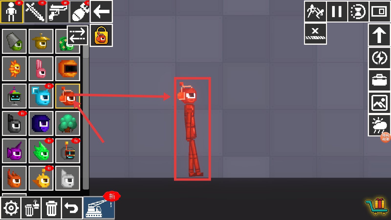 2、从左侧的物品栏中,选中红色的角色形象,将其放置到游戏场景里,为后续互动做准备。