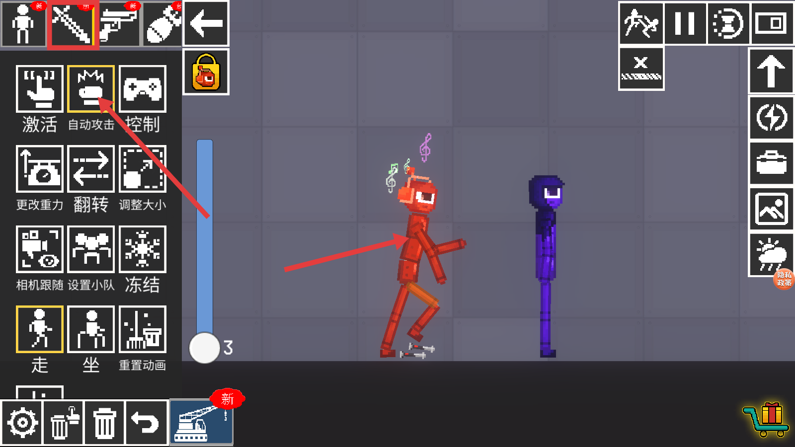 3、选中武器后,点击左侧的【自动攻击】按钮,能让场景中的红色角色自动对目标发起攻击。