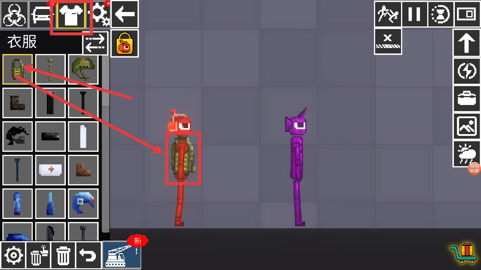 4、打开左侧的【衣服】栏,选择背包类的物品,将其装备到红色角色身上,可增强角色的道具携带能力。
