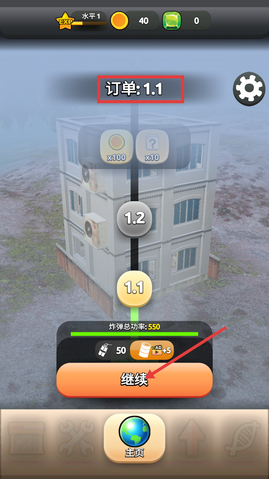 1、订单【1.1】开启后,点击橙色【继续】按钮,进入建筑爆破关卡流程,准备使用炸药。