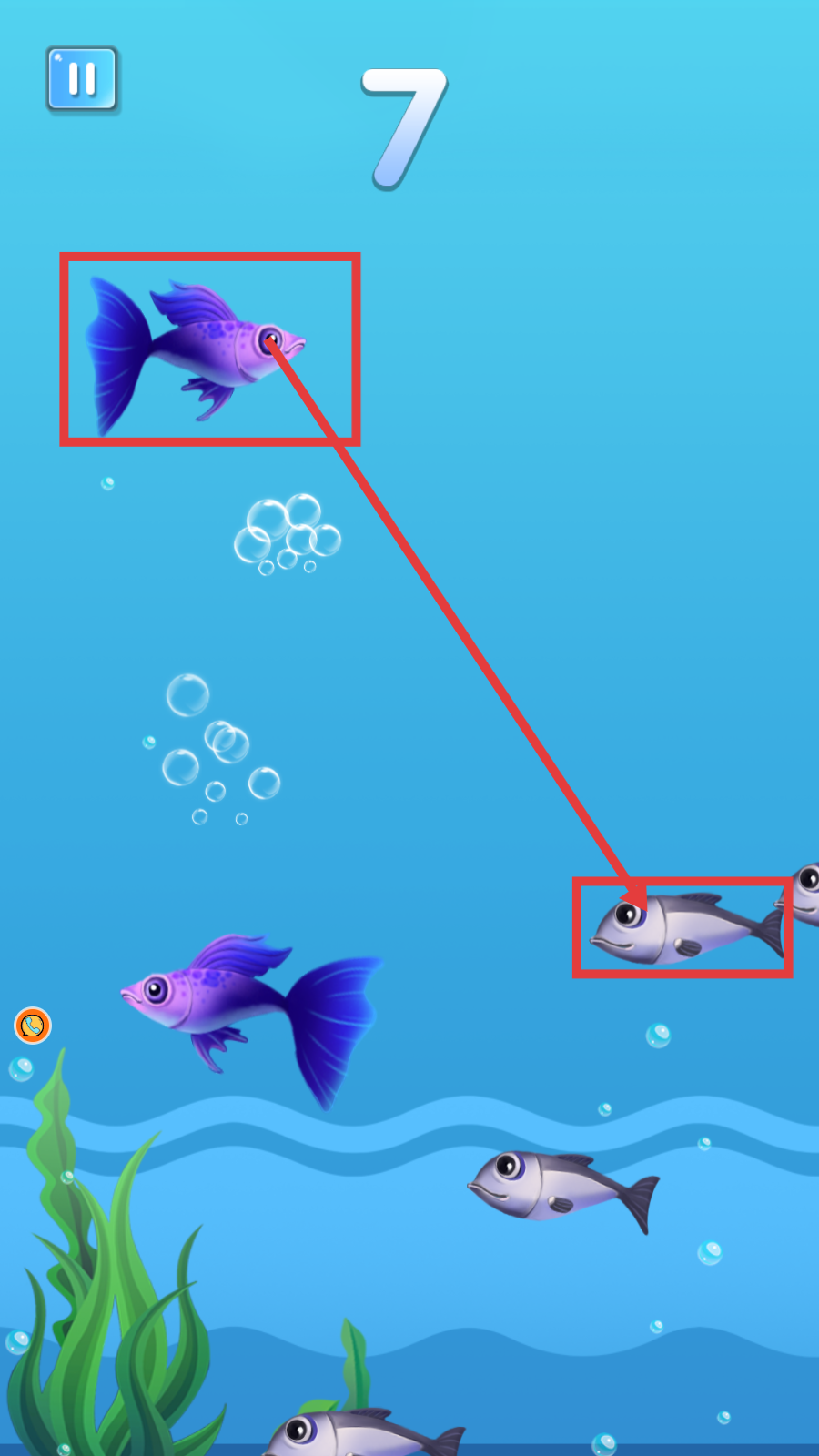 2、操控小鱼去吞噬比自身体型小的鱼,例如图中紫色小鱼可吞噬灰色小鱼,以此获取成长机会。