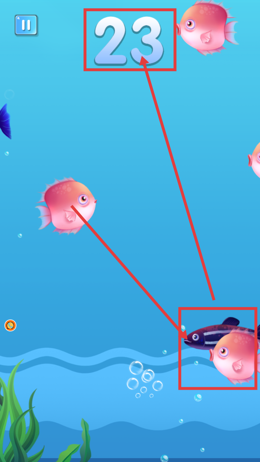 3、持续吞噬小鱼后,角色会逐渐成长,分数(如【23】)也会随之提升,需继续寻找可吞噬的目标鱼,加速自身成长。