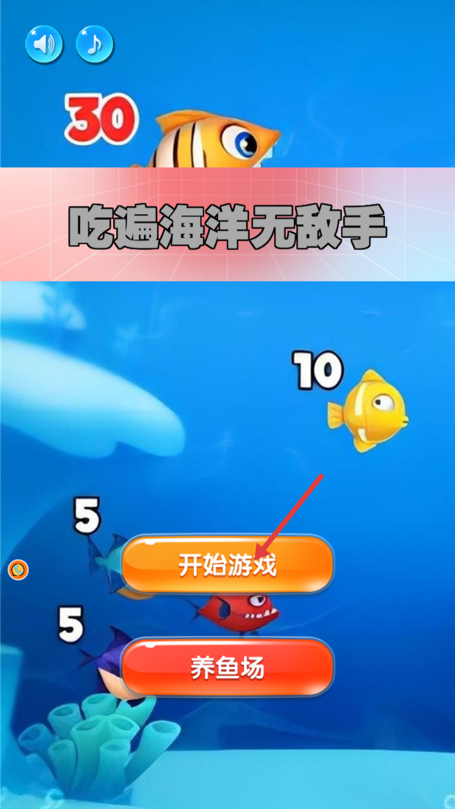 1、点击【开始游戏】,进入海洋主题的吞噬类游戏,操控小鱼开启“吃遍海洋”的成长冒险。