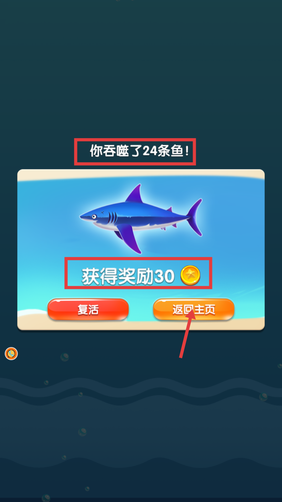 4、当结算时,若成功吞噬了【24】条鱼,能获得【30】金币奖励,之后可点击【返回主页】,为下一次冒险做准备。