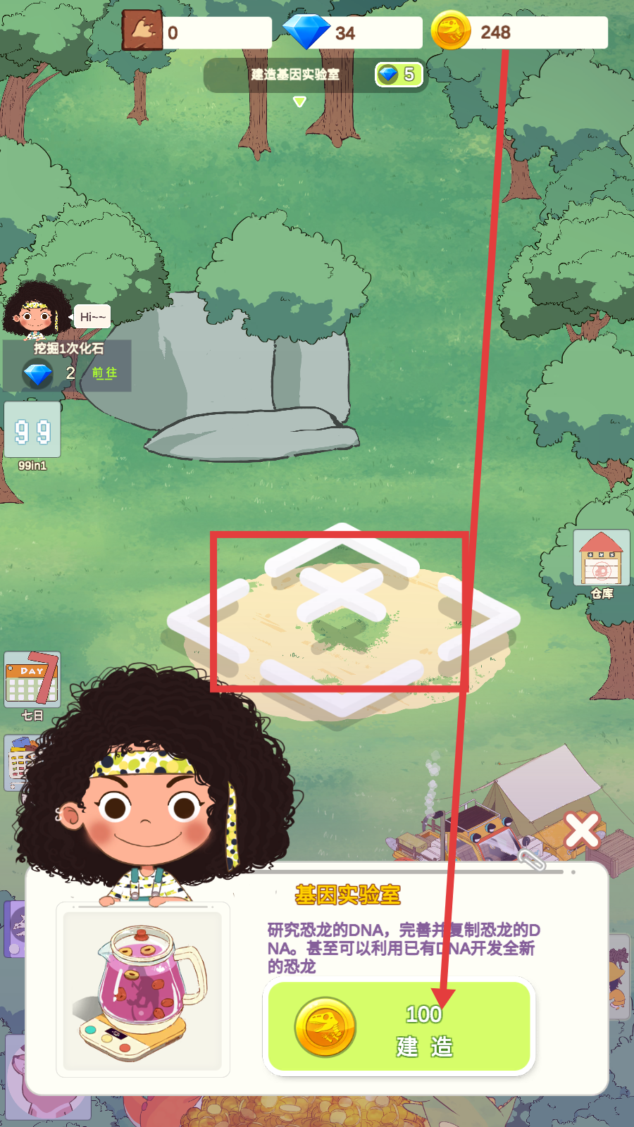 1、用100金币建造【基因实验室】,能研究复制恐龙DNA,还可开发全新恐龙,助力乐园恐龙培育。