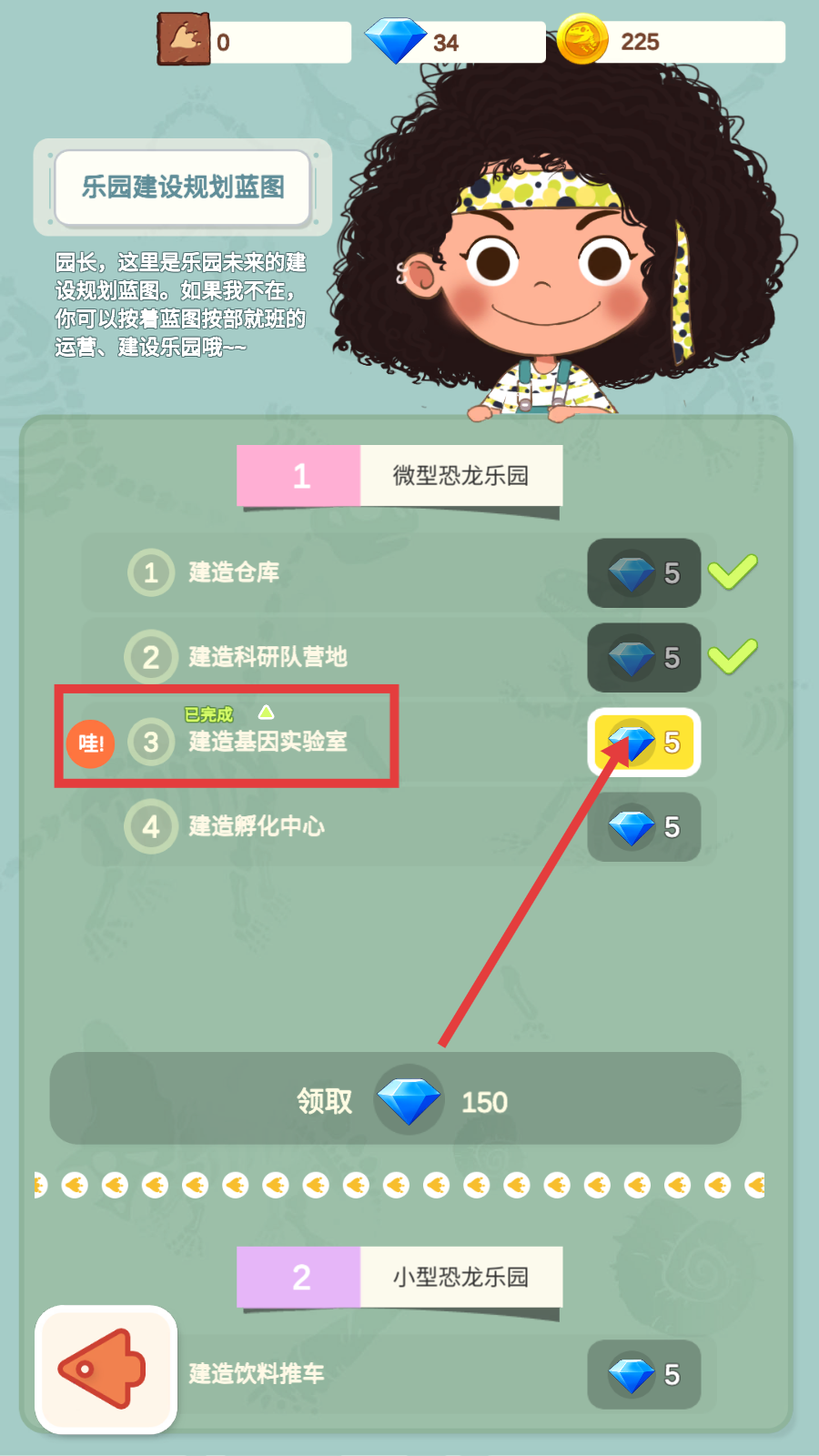 2、完成【建造基因实验室】后,在【乐园建设规划蓝图】中领取5钻石,推动后续乐园建筑建造。