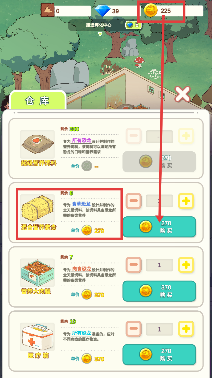 3、仓库中用270金币购买【混合营养素食】,它专为食草恐龙设计,能满足这类恐龙的营养需求。