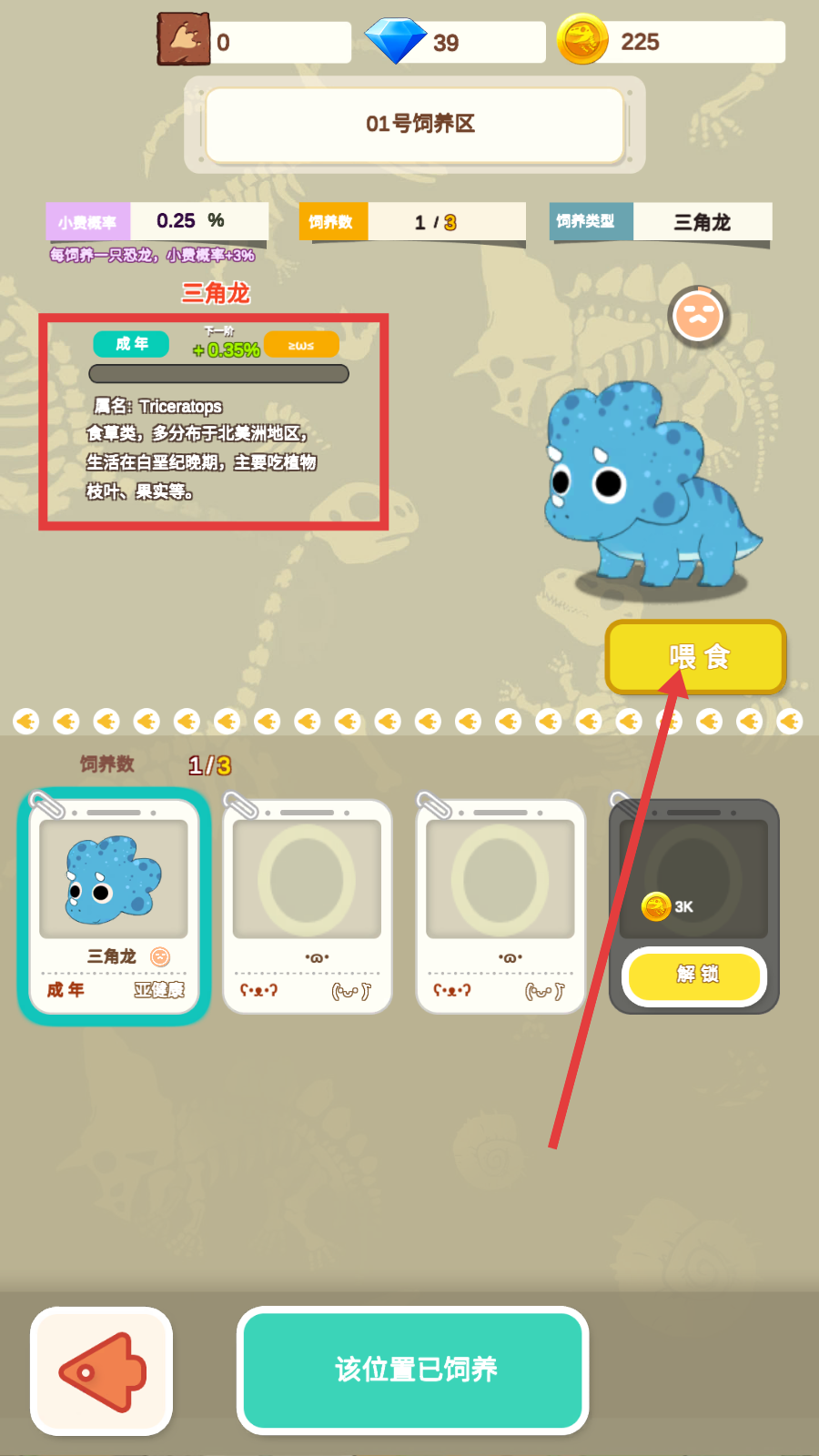 4、在【01号饲养区】,针对食草类的【三角龙】,点击“喂食”按钮给它喂食,助力其成长。