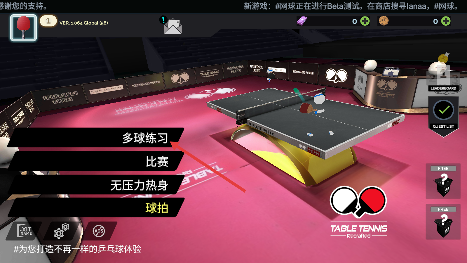 1、进入游戏后,选择【多球练习】模式,借助该模式初步熟悉乒乓球的击球手感与基本操作逻辑。