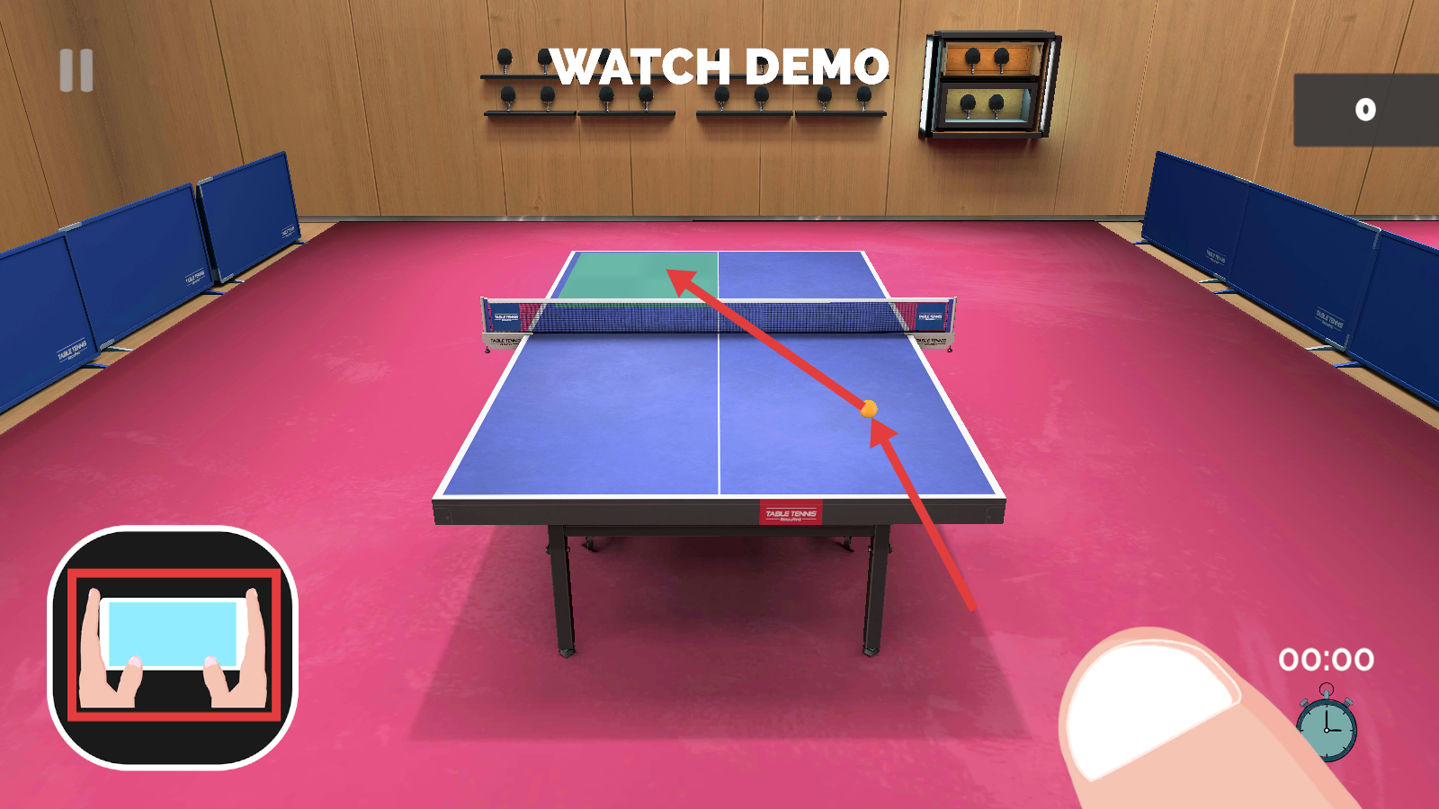 2、练习时,可参考界面的【WATCHDEMO】演示轨迹,学习把球精准击打到对面台面的目标区域的方法。