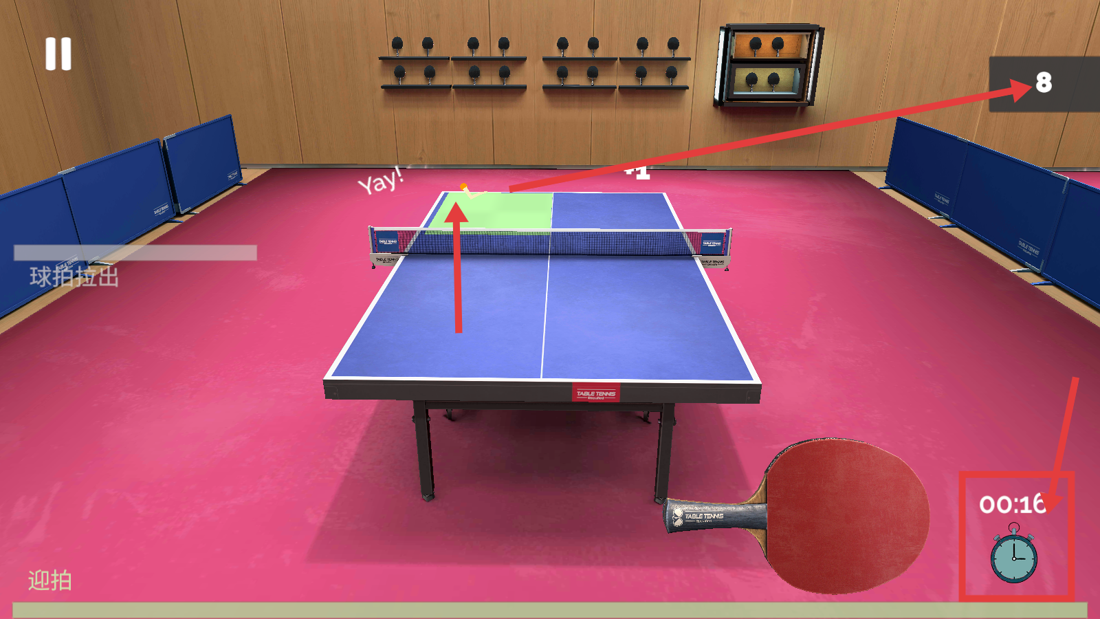 3、击球过程中,留意球的落点,同时利用右下角的计时功能,在规定时间内尽可能多得分,提升击球效率。