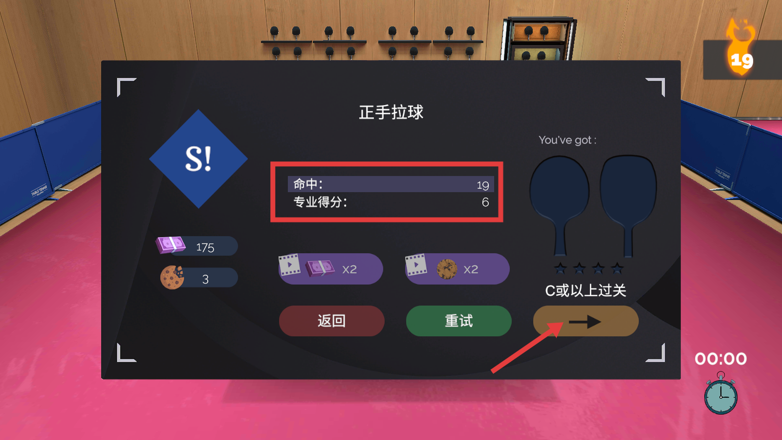 4、完成【正手拉球】练习后,查看命中数与专业得分,若想追求更高评价,可点击继续或重试来优化击球技巧。
