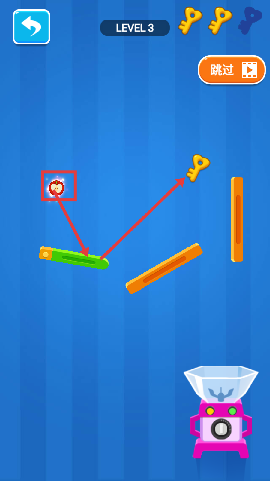 2、在【LEVEL3】里,借助绿色弹板弹射苹果,瞄准钥匙规划弹射路径。