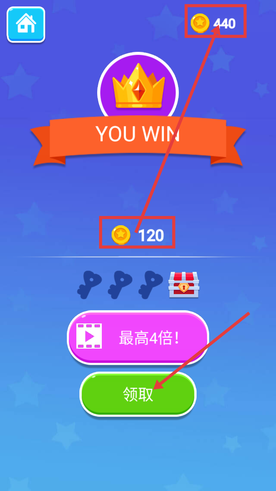 4、关卡胜利后,界面显示【YOUWIN】,点击【领取】可获得【120】金币,还能看到累计【440】金币。
