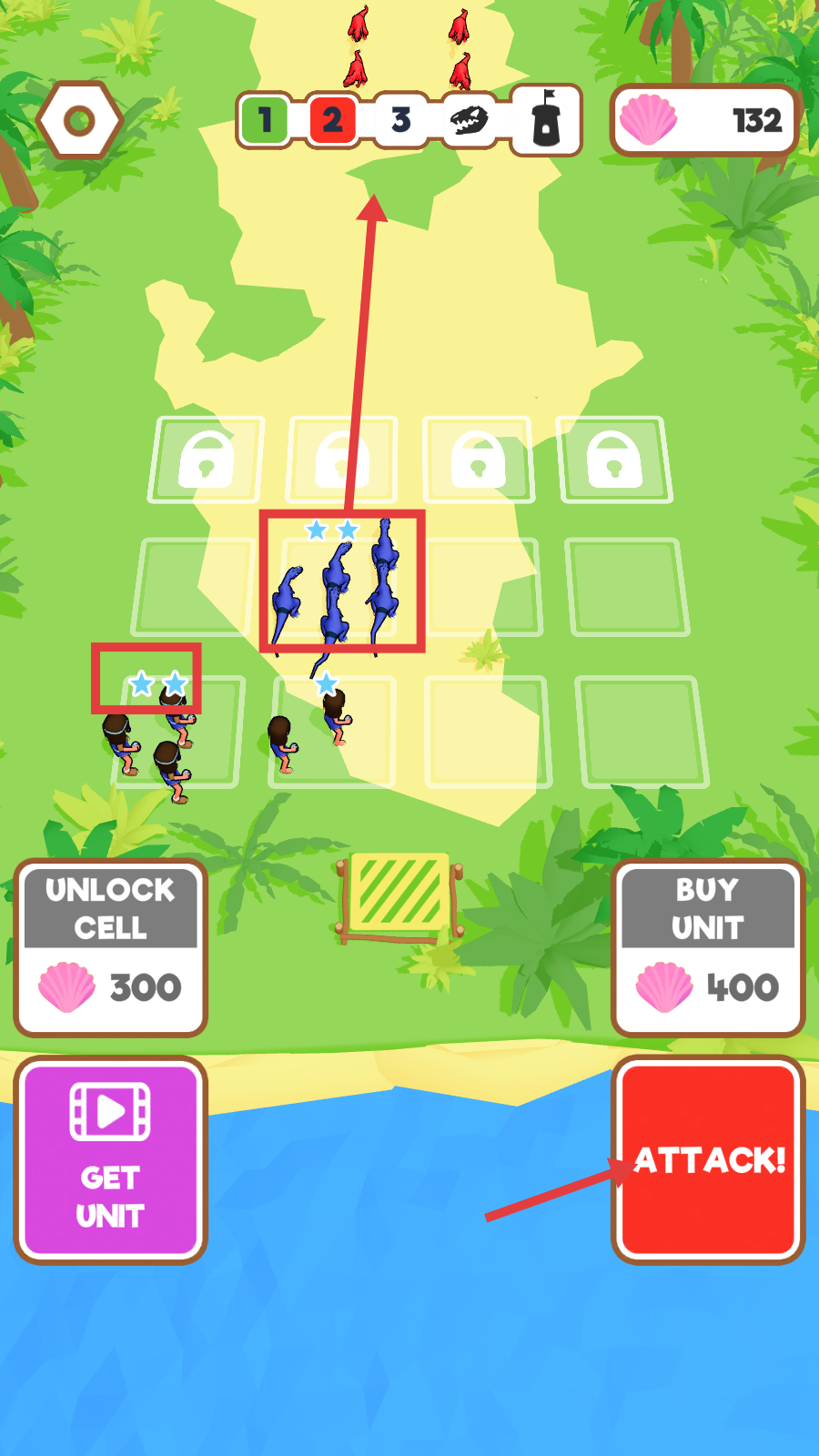 1、查看右上角贝壳数量【632】,点击【BUYUNIT-200】,消耗贝壳购买单位并部署到对应格子,为战斗筹备力量。