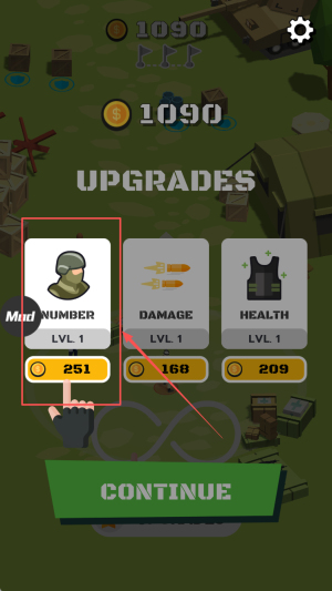 4、如何升级角色?在升级界面,点击“NUMBER”、“DAMAGE”或“HEALTH”下方的金币按钮,使用获得的金币升级角色属性。