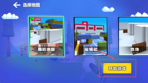 2、如何选择地图?在地图选择界面,点击“开始游戏”按钮,选择随机地图、运输船或雪地开始游戏。