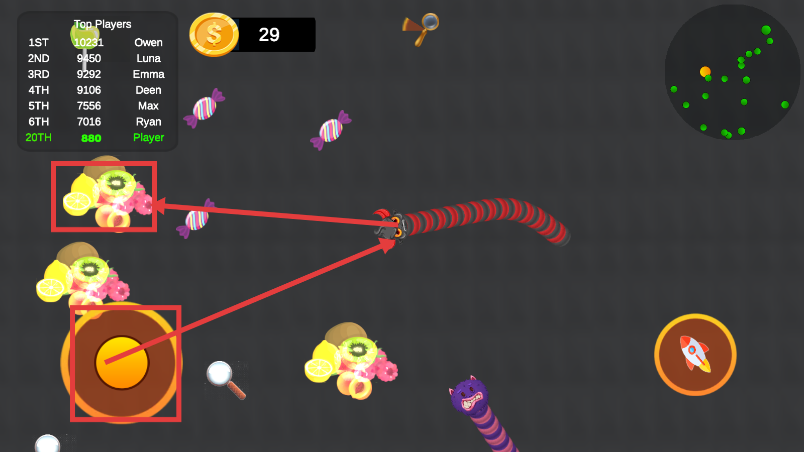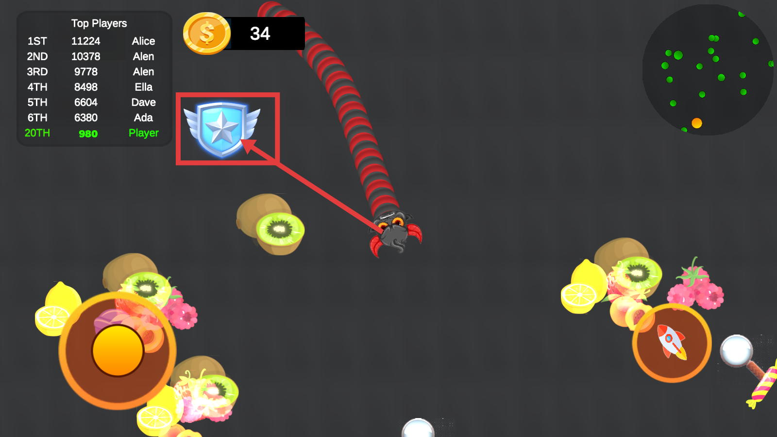 2、对局内优先收集水果类资源,同时关注【Top-Players】榜单了解排名,借此积累金币提升进度。