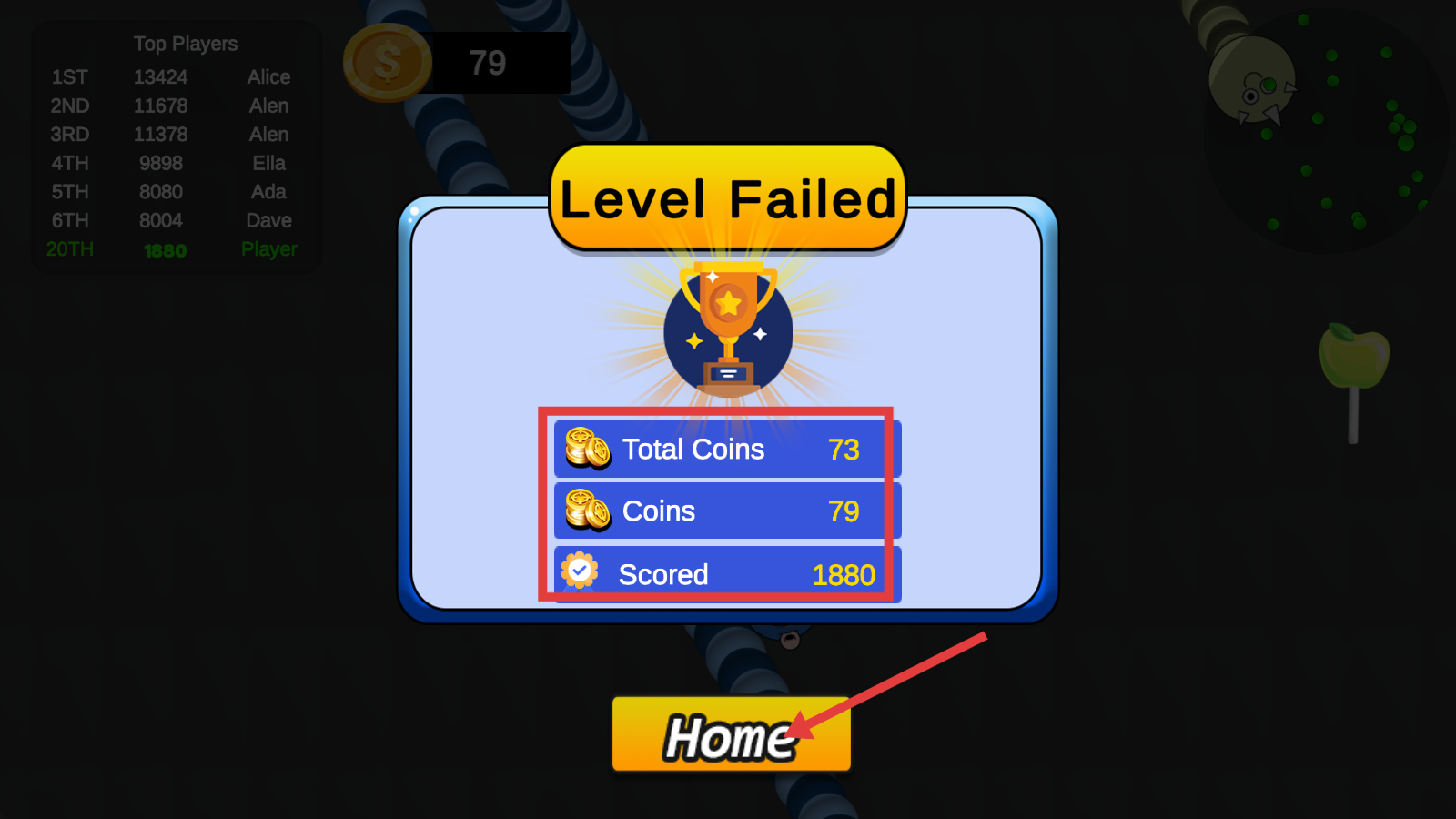 4、若关卡失败,查看【Total-Coins】【Coins】【Scored】的结算数据,再点击【Home】按钮返回主界面重新挑战。