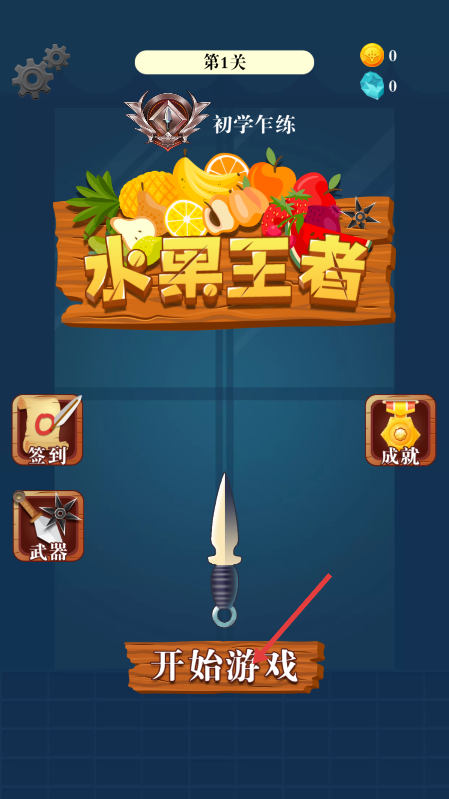 1、进入【水果王者】游戏,点击木质的【开始游戏】按钮,进入第1关【初学乍练】关卡。