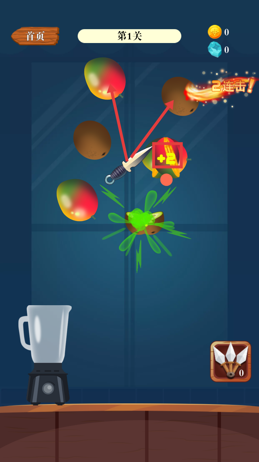 2、在第1关切水果时,尽量让刀具连续切割芒果、猕猴桃等水果,触发【2连击】并获取【+2】增益,提升得分。