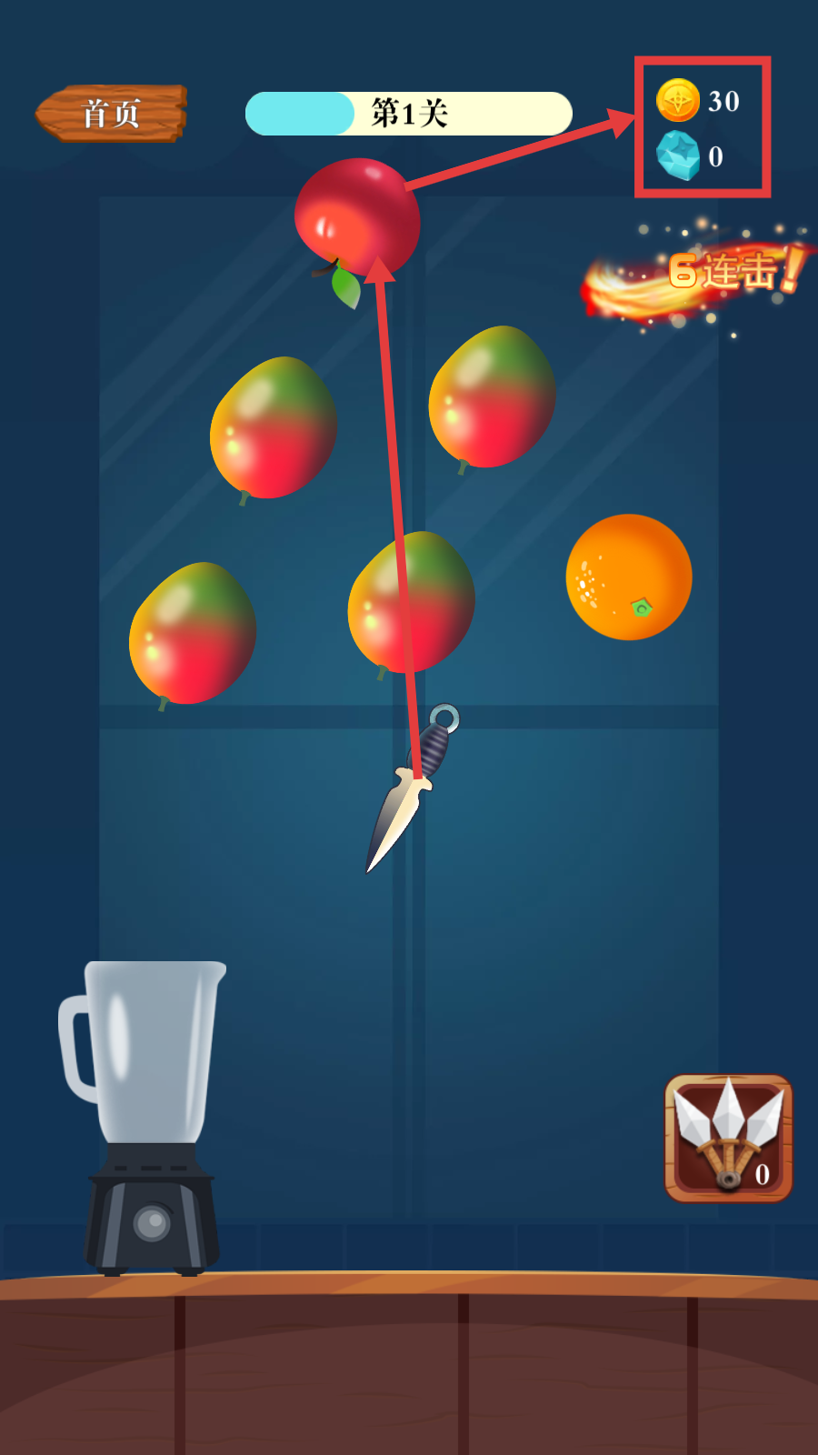 3、切水果过程中,瞄准苹果、芒果等水果进行切割,通过连击操作积累金币,使金币数量增长。