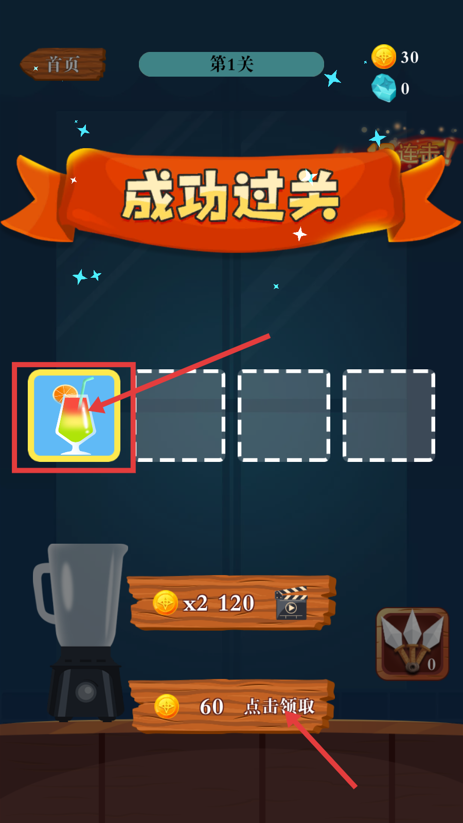 4、成功过关后,界面显示【成功过关】,点击木质的【60-点击领取】按钮获取金币,还能解锁饮品图标类奖励。