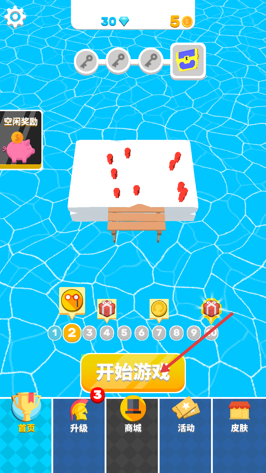 1、进入游戏后,能看到顶部显示【5-金币】,左侧有【空闲奖励】入口,点击下方黄色的【开始游戏】按钮,即可进入答题环节。