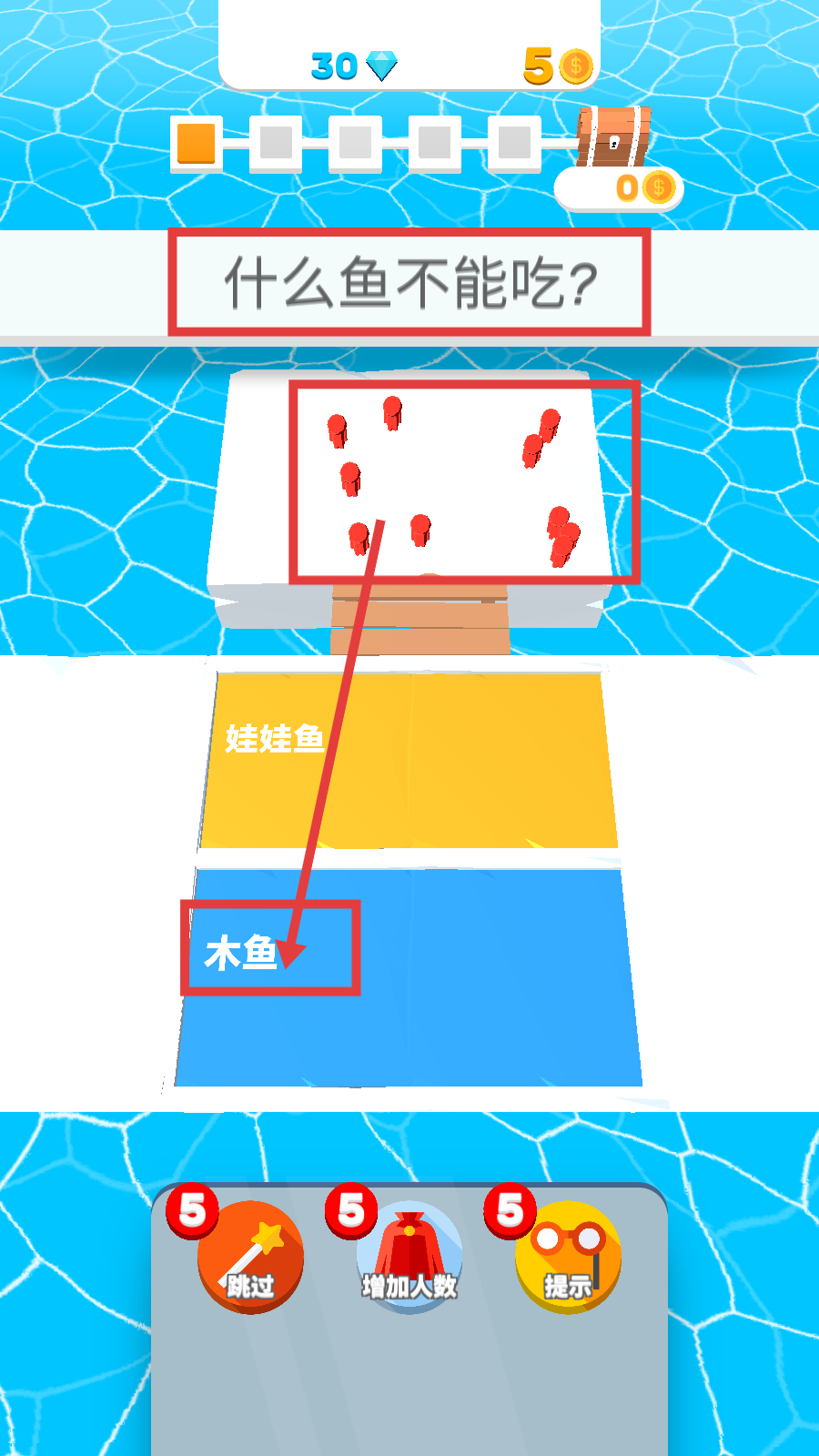 2、答题过程中,碰到“什么鱼不能吃?”这类问题时,要选择正确答案,像这道题应选择【木鱼】,从而推进游戏流程。