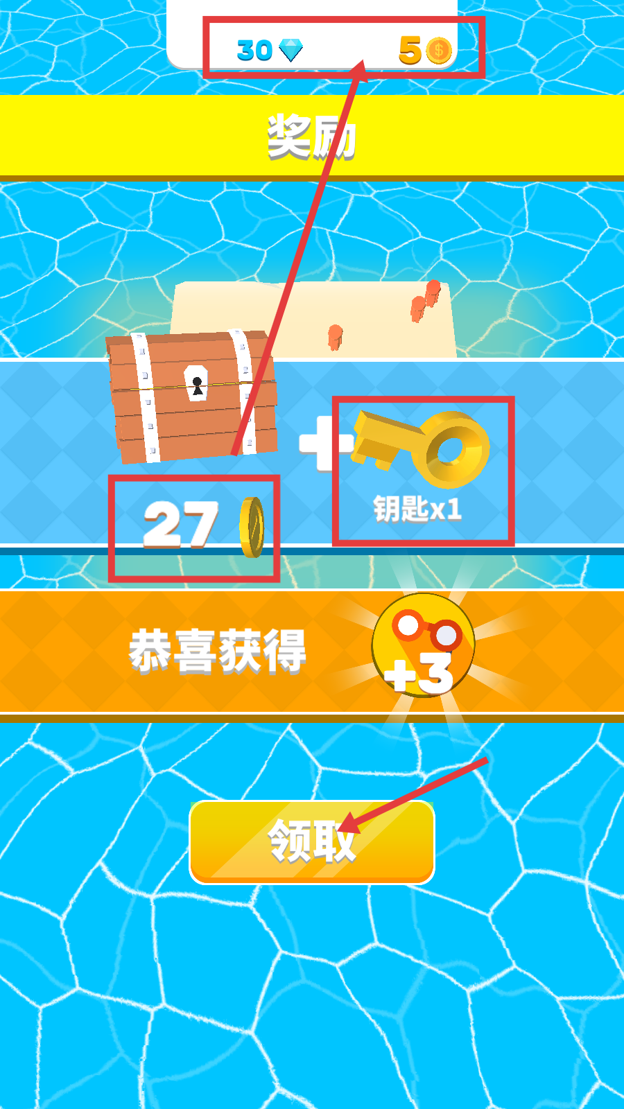 4、成功答对题目后,会进入奖励界面,可领取【27-金币】、【钥匙x1】等奖励,点击黄色的【领取】按钮,就能获取这些奖励。
