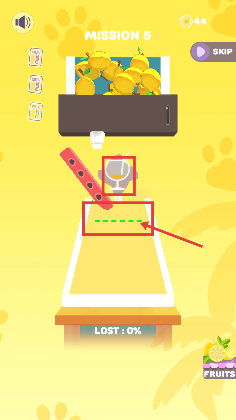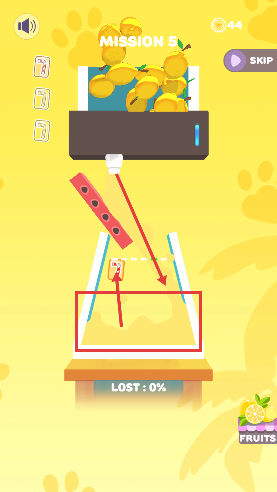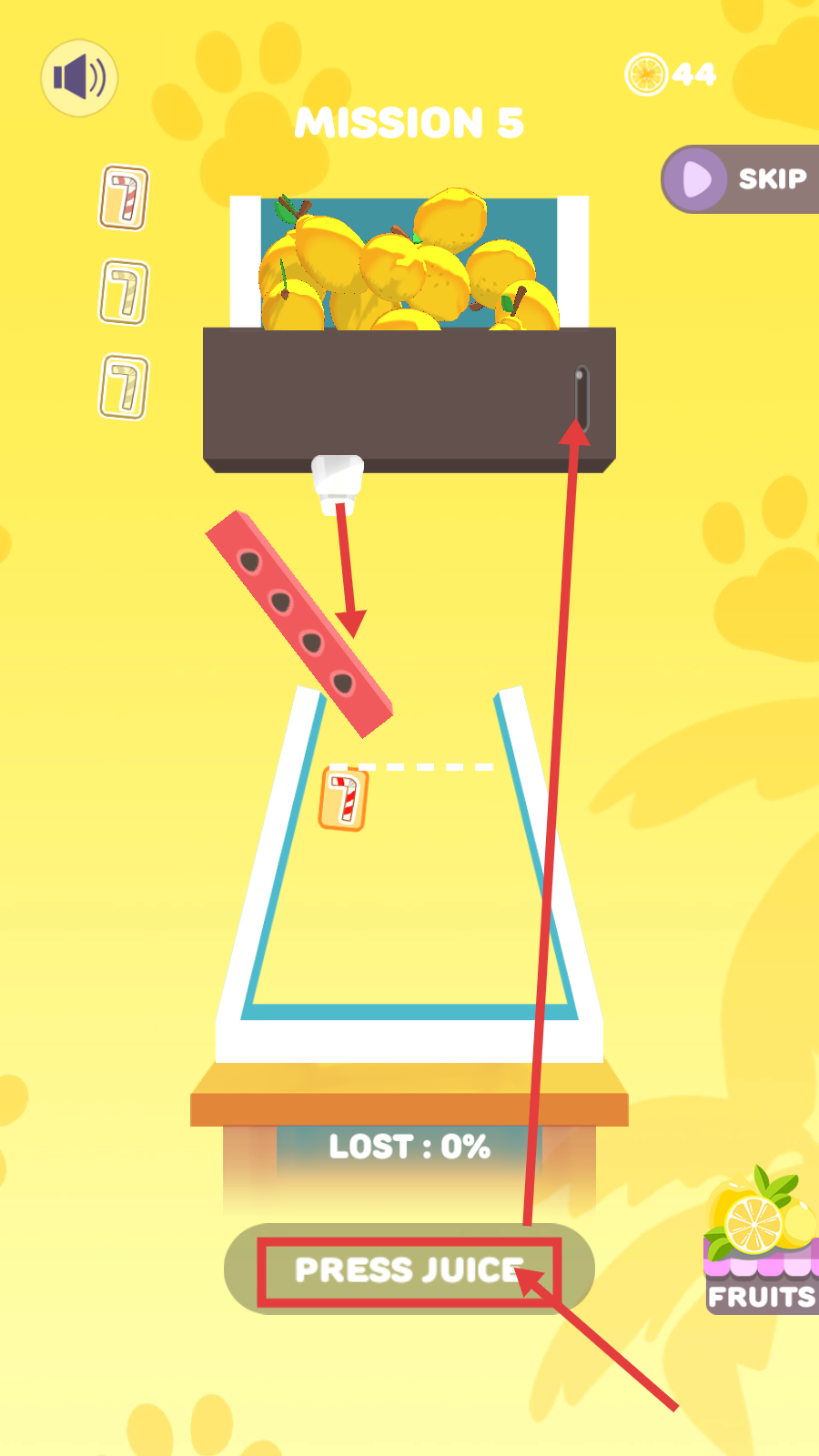 1、进入【Mission-5】后,看到上方的柠檬,点击下方【PRESS-JUICE】按钮,启动榨汁流程,让水果进入榨汁区域。