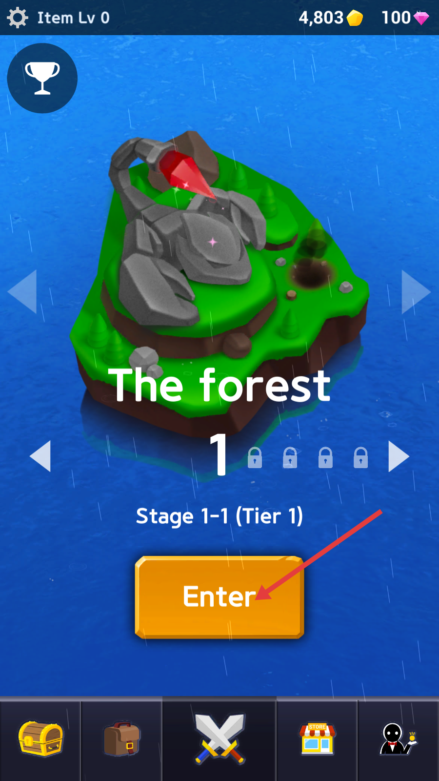 1、点击【Enter】按钮,进入【The-forest-1】的【Stage-1-1-(Tier-1)】关卡,开启冒险战斗挑战。