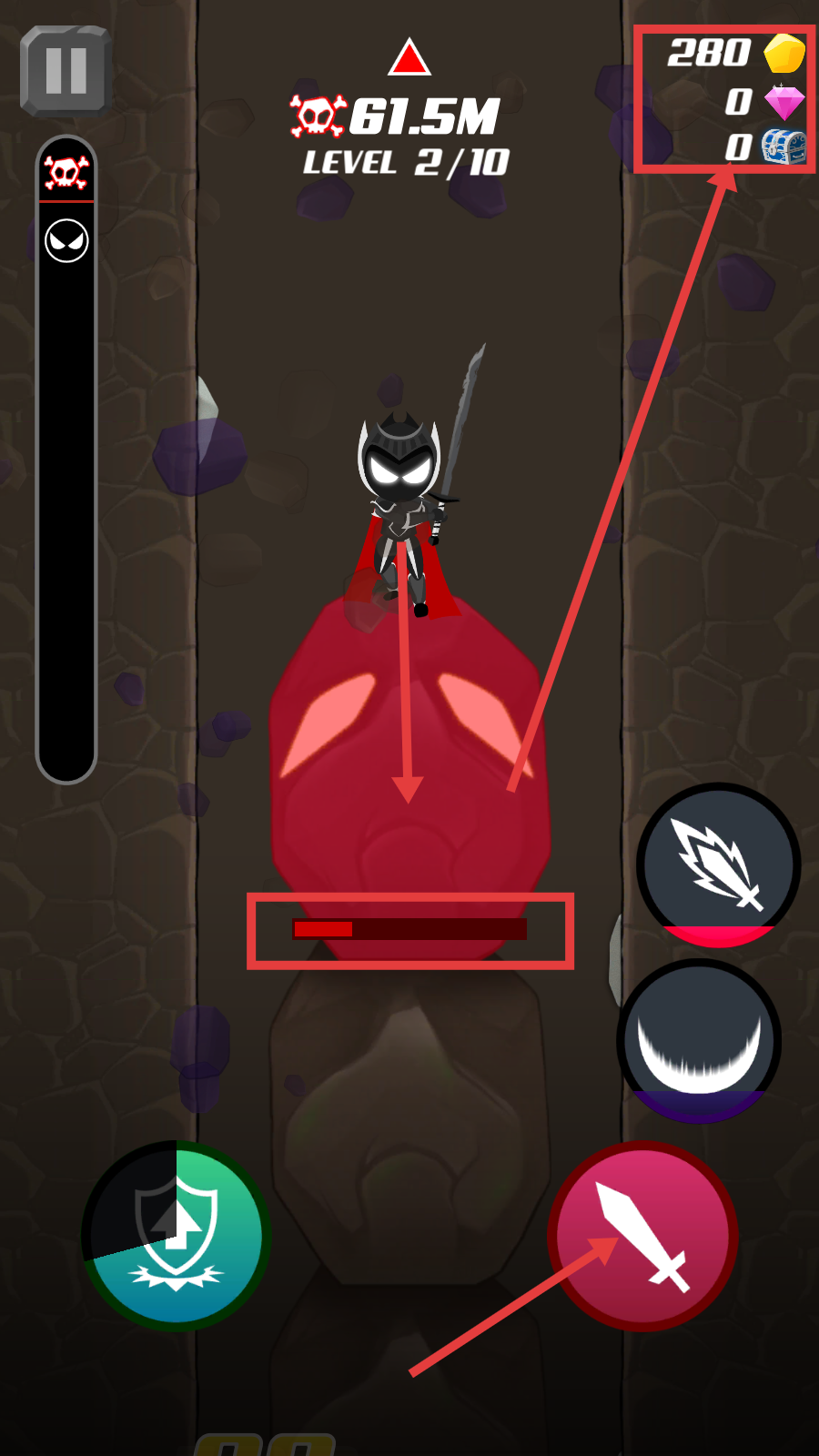 2、战斗中,点击红色剑形按钮攻击红色目标,同时关注上方显示的【280】金币等资源,留意目标的血条变化。