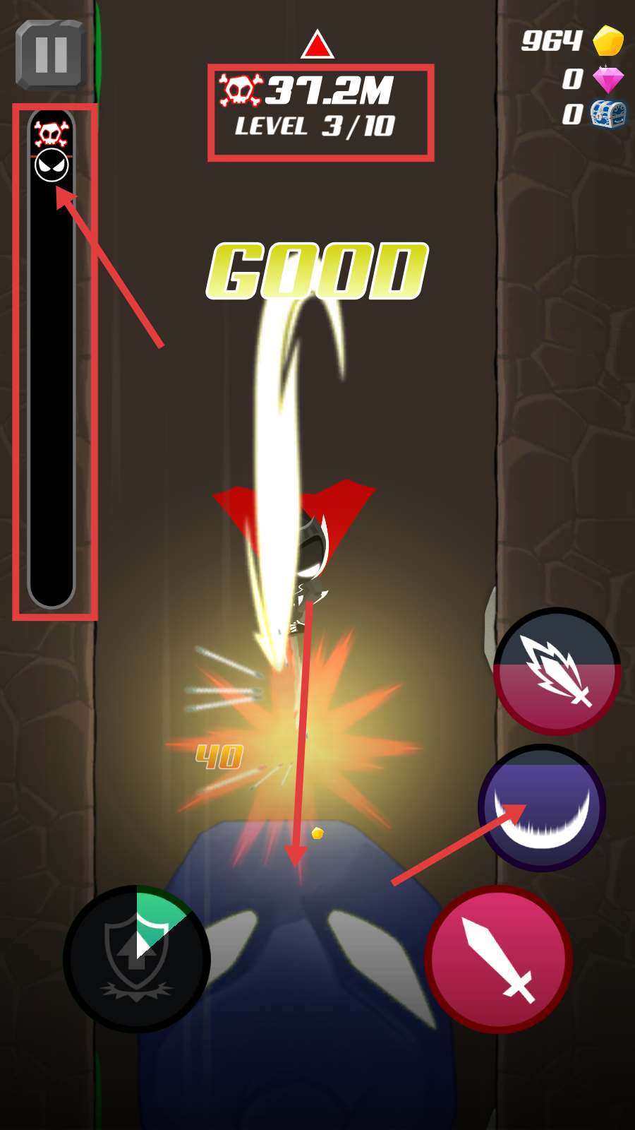 3、升级至【Level-3/10】后,可使用右侧月牙形等技能按钮作战,注意左侧进度条状态,释放技能造成伤害。