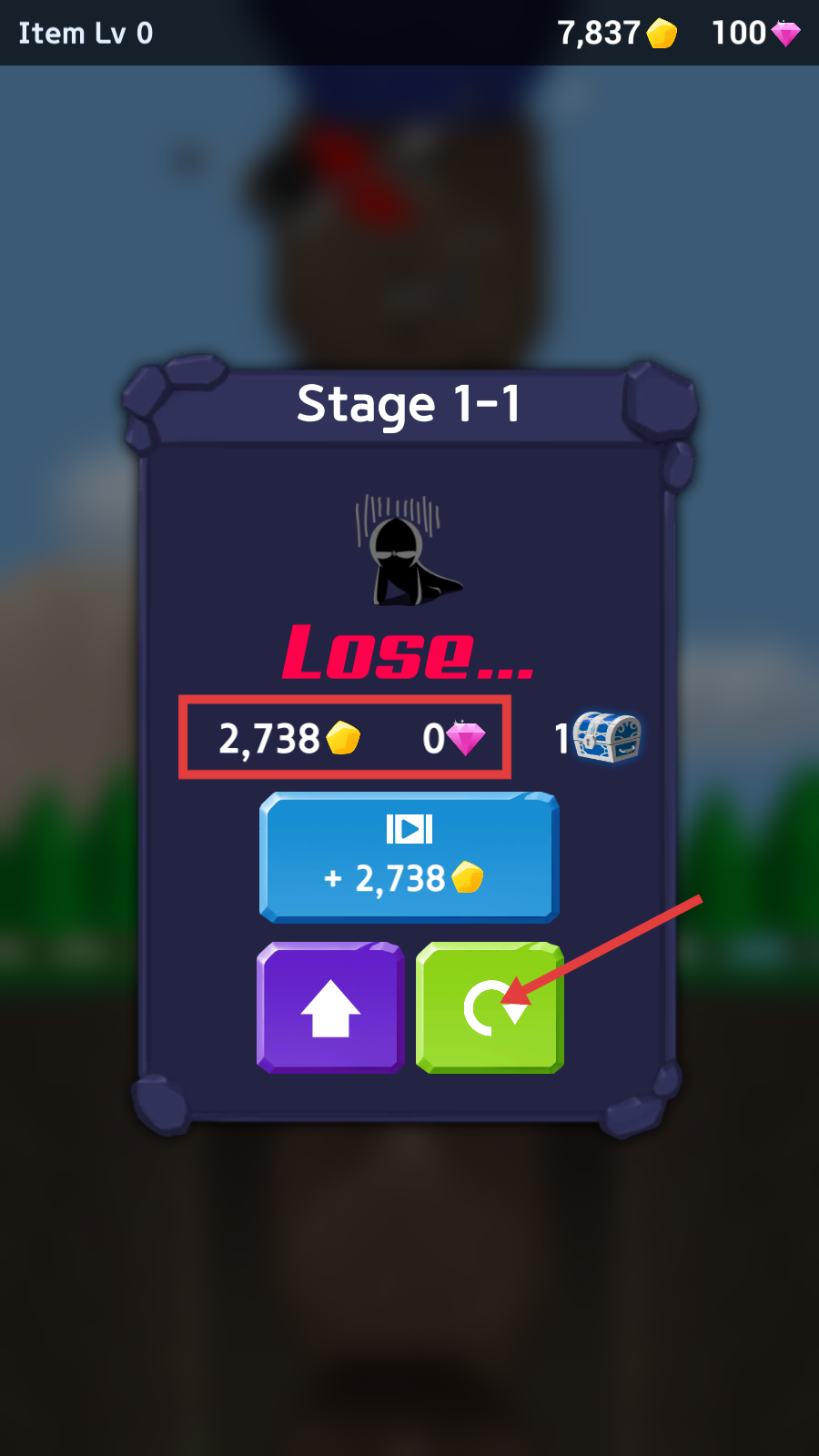 4、若关卡失败显示【Lose...】,可查看获得的【2,738】金币,点击绿色重新开始按钮,再次挑战【Stage-1-1】关卡。